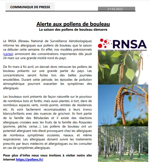 Le printemps n’arrive jamais seul ! La saison des pollens de bouleau est sur le point de débuter, selon le RNSA (Réseau National de Surveillance Aérobiologique).