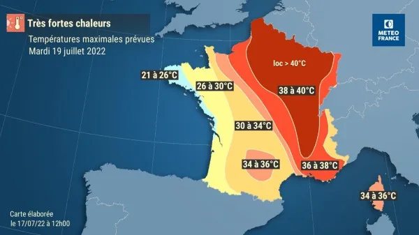 Si ce lundi pourrait être le plus chaud jamais enregistré en France (en faisant la moyenne de plusieurs dizaines de stations météo), le pic de chaleur est attendu ce mardi dans les Hauts-de-France. "Le pic de chaleur est attendu en journée de mardi, sous un vent de sud-est sensible, avec des températures maximales de 38 à 40°C, alors proches des valeurs records", écrit Météo France. La barre des 40°C pourrait même être dépassée localement dans la région, notamment dans le sud de l'Aisne et de l'Oise.