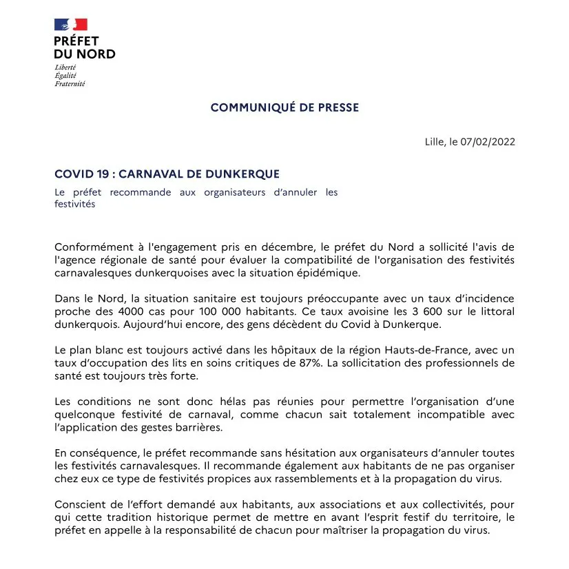 Dans un communiqué diffusé ce lundi, le préfet du Nord demande aux organisateurs du carnaval de Dunkerque d'annuler les festivités, alors que la situation sanitaire reste "toujours préoccupante".