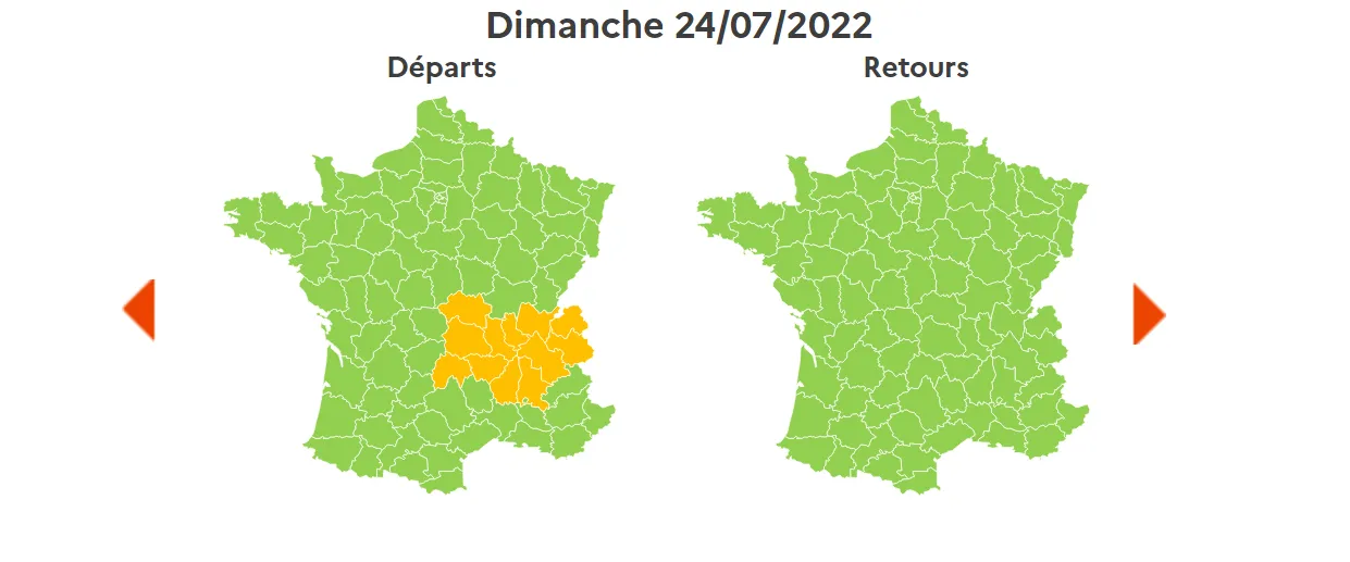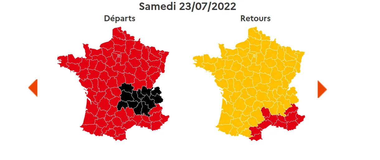 Le plus compliqué est prévu pour samedi 23 juillet. La journée est classée rouge dans toute la France pour les départs. La circulation sera plus faible mais quand même difficile dans le sens des retours, en particulier dans l’arc méditerranéen.