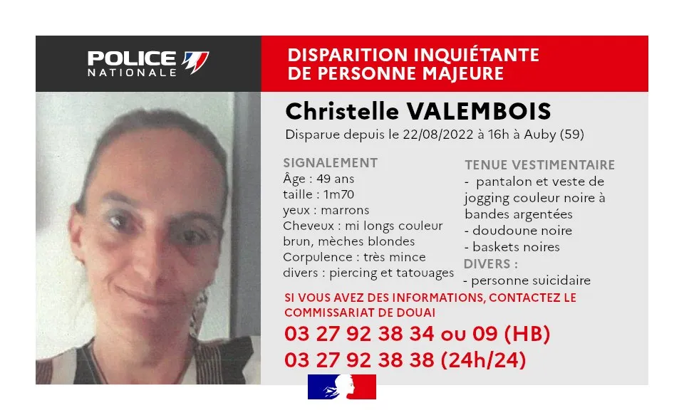 Disparition inquiétante dans le Nord. Christelle Valembois, 49 ans, n'a plus donné de nouvelles depuis lundi à 16 heures à Auby, près de Douai. Un appel à témoins a été diffusé ce mardi sur les réseaux sociaux.