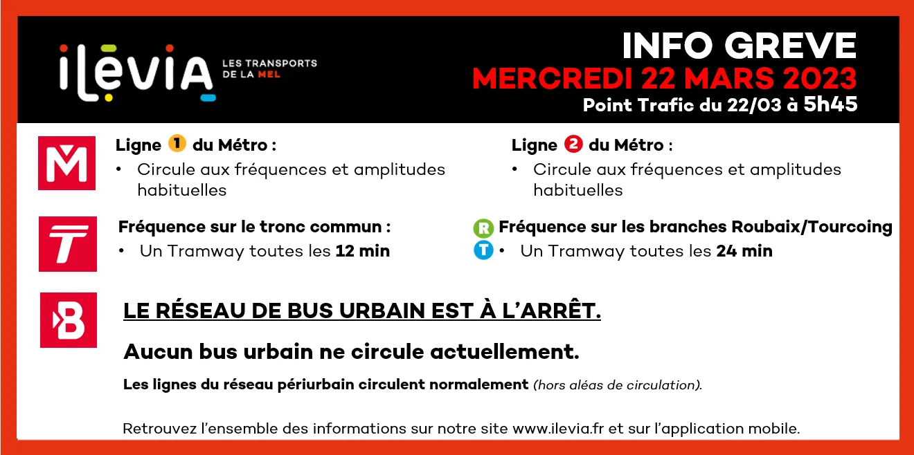 Le trafic des tramways est ralenti avec un tramway toutes les 12 minutes sur le tronc commun, et toutes les 24 minutes sur les branches Roubaix / Tourcoing. Les deux lignes du métro circulent normalement et "le réseau de bus périurbain et les lignes scolaires circulent aux amplitudes et fréquences habituelles", précise Ilévia.