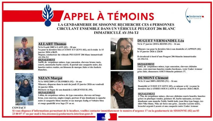 Les circonstances exactes de leur départ restent floues et les enquêteurs cherchent encore à déterminer comment les quatre jeunes se connaissaient. Toute personne disposant d’informations est invitée à contacter le 17 ou la gendarmerie de Sissonne au 03 23 80 07 17.