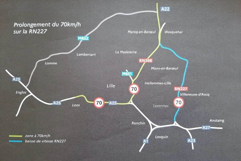Pensez à lever le pied si vous empruntez aujourd'hui la RN 227 dans la métropole lilloise. La vitesse maximale autorisée passe de 90 à 70 km/h ce mardi sur la portion qui va des 4 Cantons à Villeneuve d'Ascq au Château Rouge à Marcq-en-Barœul. C'est l'un des axes les plus fréquentés de la métropole lilloise, assurant la liaison entre les autoroutes A1, A23, A27 au sud et à l’est de Lille et l’autoroute A22 vers la Belgique.