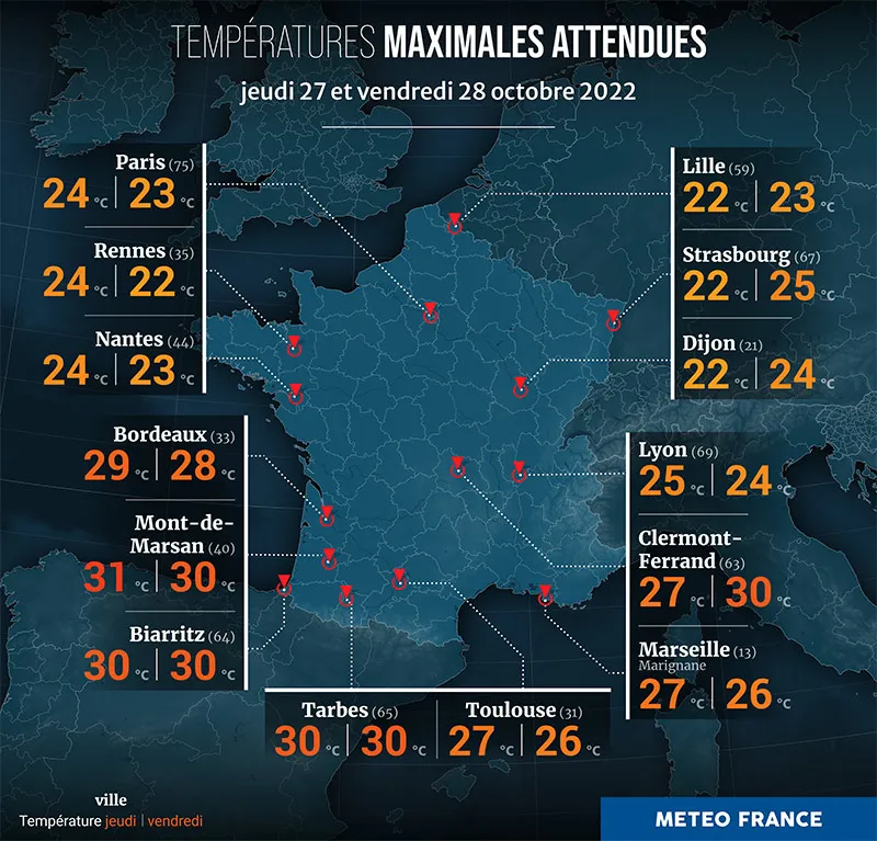 Pendant ces deux jours, les températures maximales seront de 20 à 25 °C au nord de la Loire, et entre 23 et 29 °C plus au sud. Ces températures seront comprises entre 29 et 31 °C dans les Pyrénées-Atlantiques, les Landes et les Hautes-Pyrénées. On pourrait même approcher des 30 °C vendredi, localement, en Auvergne, dans l’Allier et le Puy-de-Dôme.