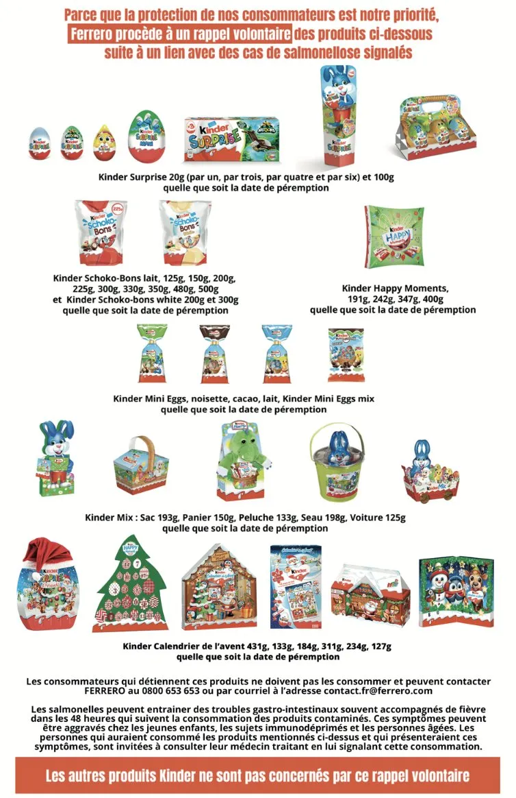 Mardi 12 avril, deux agences de surveillance européennes ont confirmé la détection de 150 cas de salmonellose dans 9 pays européens, dont la France, en lien avec la consommation de certains produits de la marque Kinder. Une semaine avant, le groupe Ferrero avait annoncé un rappel de plusieurs produits fabriqués dans l'usine d'Arlon en Belgique.