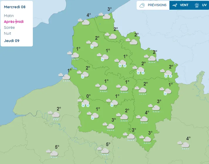 Une vigilance orange "neige-verglas" sera déclenchée mercredi à 16 heures dans le Nord - Pas-de-Calais et la Somme. "On attend des cumuls de neige de 5 à 10 cm sur l’ensemble de l’épisode", précise le communiqué de Météo France. D'autres chutes de neige, moins importantes, pourraient toucher également la région en fin de nuit de mercredi à jeudi, et jeudi dans la matinée.
