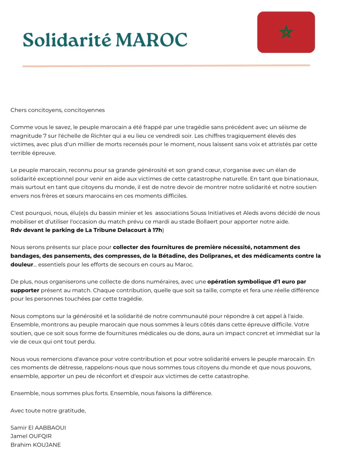 Après le terrible tremblement de terre qui a touché le Maroc vendredi 8 septembre, trois adjoints aux maires franco-marocains de Sallaumines, Avion et Leforest lancent un appel aux dons, à l’occasion du match Maroc - Burkina Faso maintenu ce mardi 12 septembre, au Stade Bollaert de Lens.