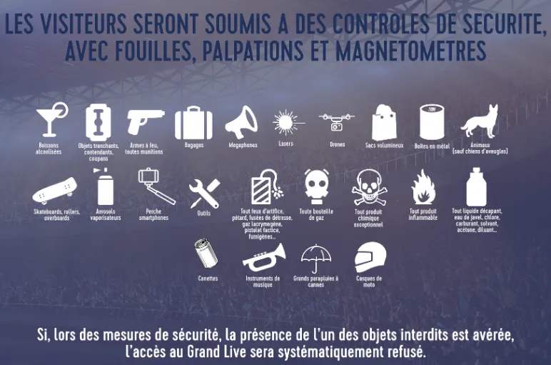 Toute boisson ou nourriture extérieure vous sera refusée à l’entrée et doit donc être consommée avant le passage aux contrôles de sécurité (hormis les bouteilles d’eau, sans bouchon).