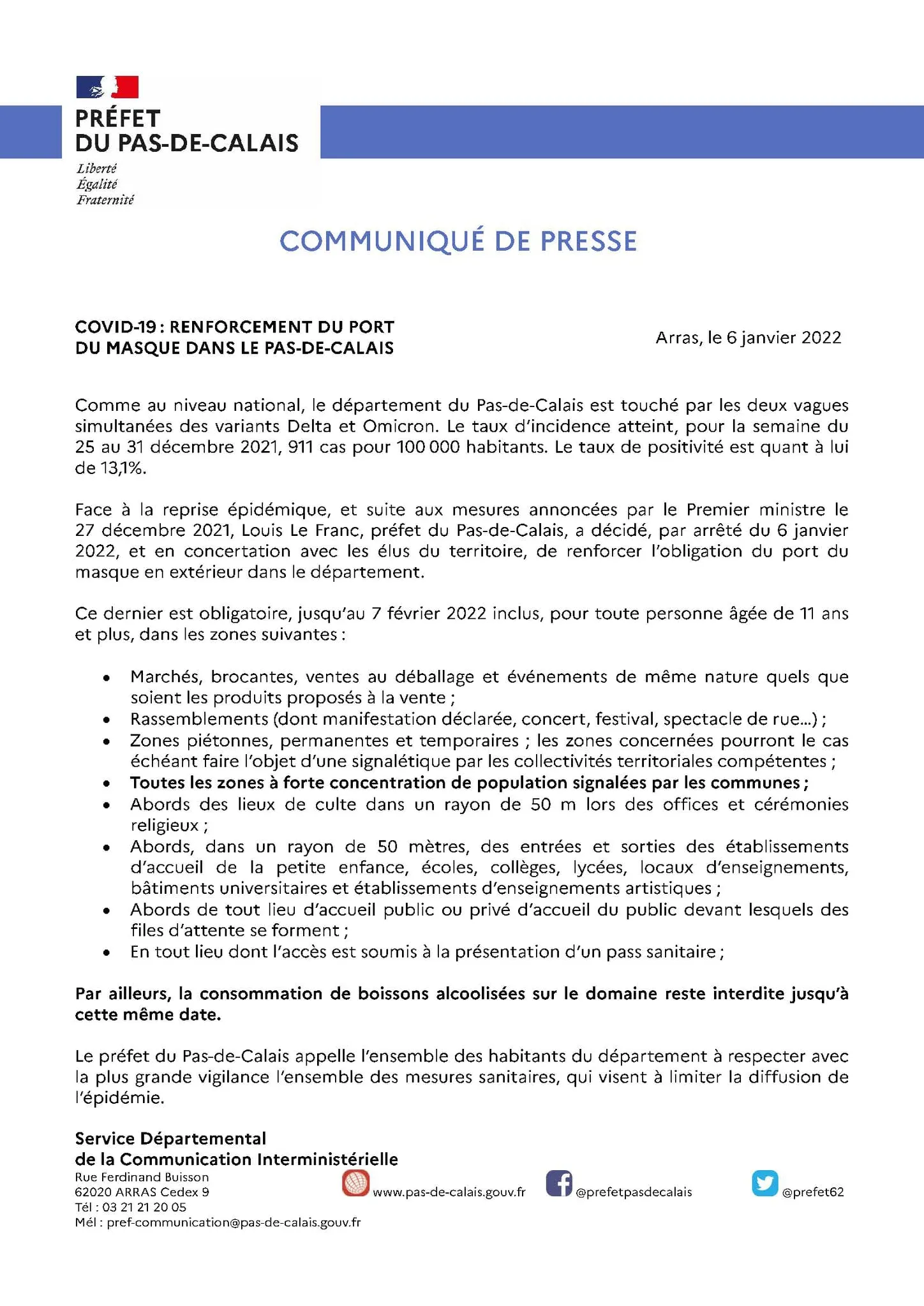 La Préfecture du Pas-de-Calais renforce l’obligation du port du masque en extérieur
