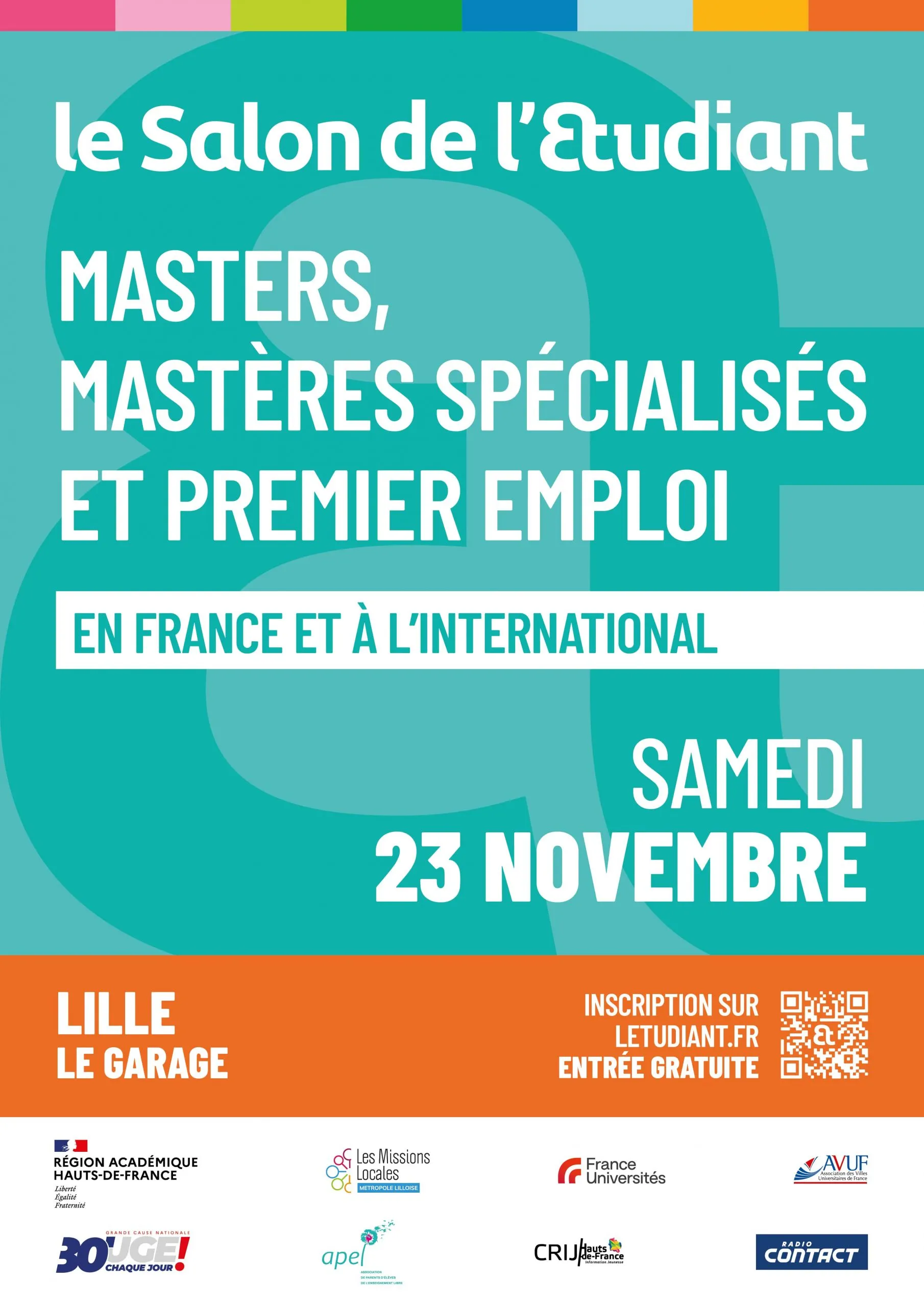 Vous envisagez d'approfondir vos études après un bac+3 ou de spécialiser davantage votre parcours académique ? Rendez-vous au Salon de l'Etudiant masters, mastères spécialisés et premier emploi, en France et à l'international, le samedi 23 novembre 2024 au Garage Lille !