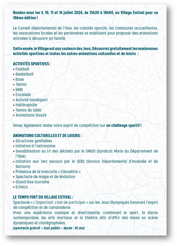 Le Village Estival du Conseil départemental de l’Oise va sillonner les routes de la région et fera étape dans 4 communes de notre département du 9 au 16 juillet 2024 de 13h30 à 18h, pour proposer des activités sportives, culturelles, ludiques et gratuites à partager en famille.