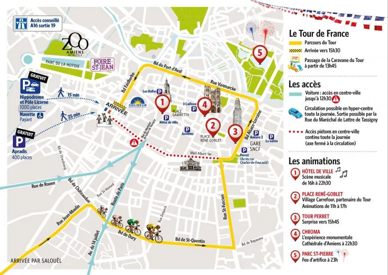 Le samedi 14 juillet, la 8ème étape du Tour de France s'arrêtera à Amiens. La municipalité et la métropole viennent de communiquer sur le plan de circulation et de stationnement mis en place ce jour-là.