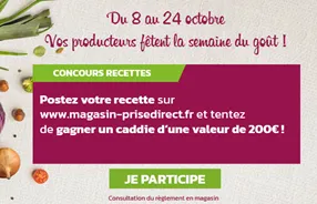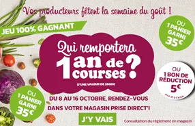 En plus, la “Semaine du Goût” est faite pour cela ! Nos producteurs seront présents et nous avons mis en place en magasin un jeu 100% gagnant ! 1 an de courses à gagner pour découvrir toujours plus de goûts et grâce à nos producteurs. (accompagner cet article de la bannière promo de l’opération)